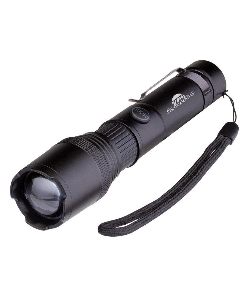 Flashlight Power Bank. 1,200 lumen P50 LED. 5 light modes including strobe and SOS. 2,000 mAh power bank. Sturdy, telescoping aluminum body w/lens focusing functionality. USB-A output port to charge devices. USB-C input port to recharge item. Includes wrist strap and belt clip. Includes USB-C charging cable. 1-1/4"W x 6-1/4"H (Retracted). 1-1/4"W x 7"H (Expanded).